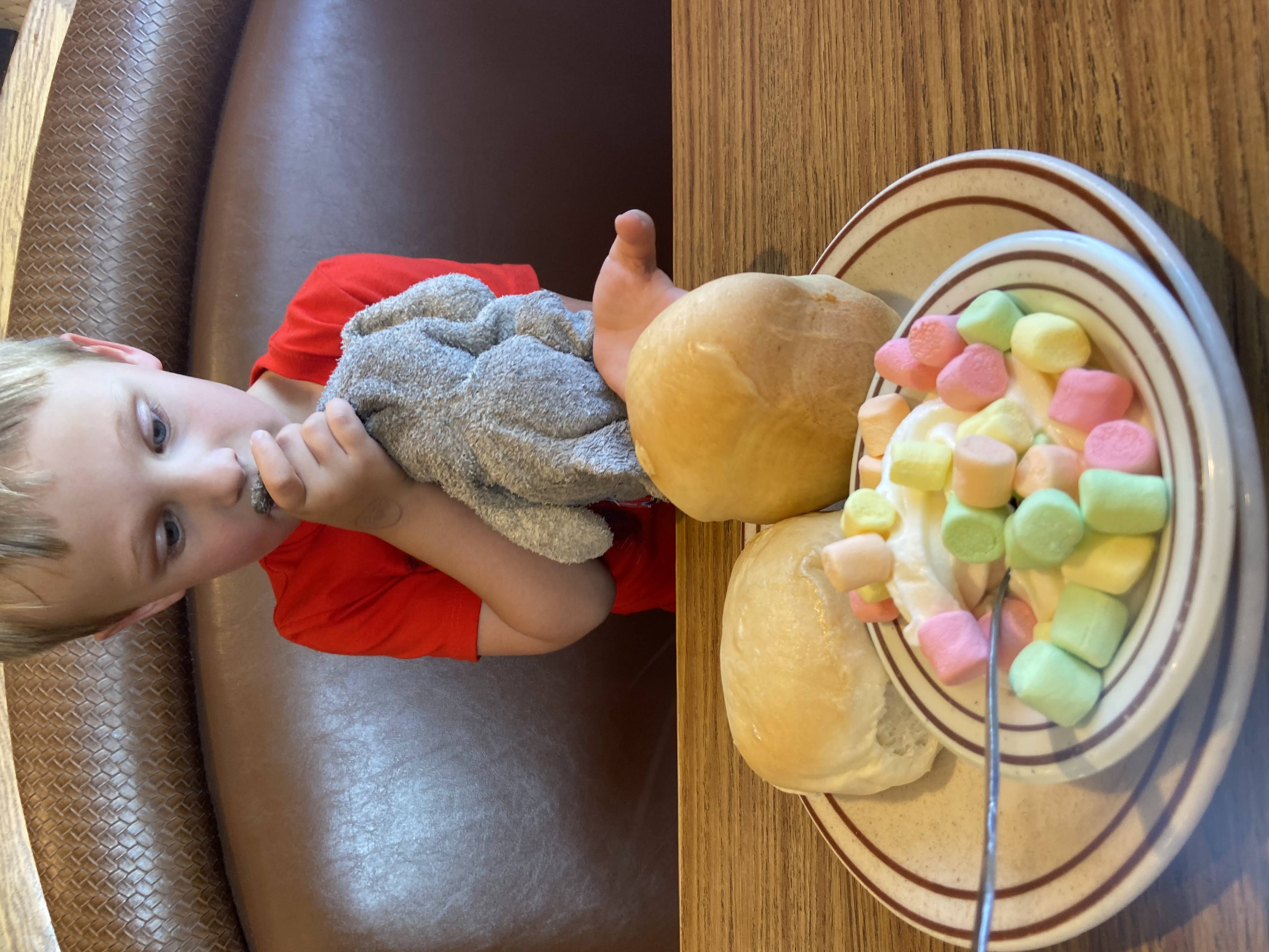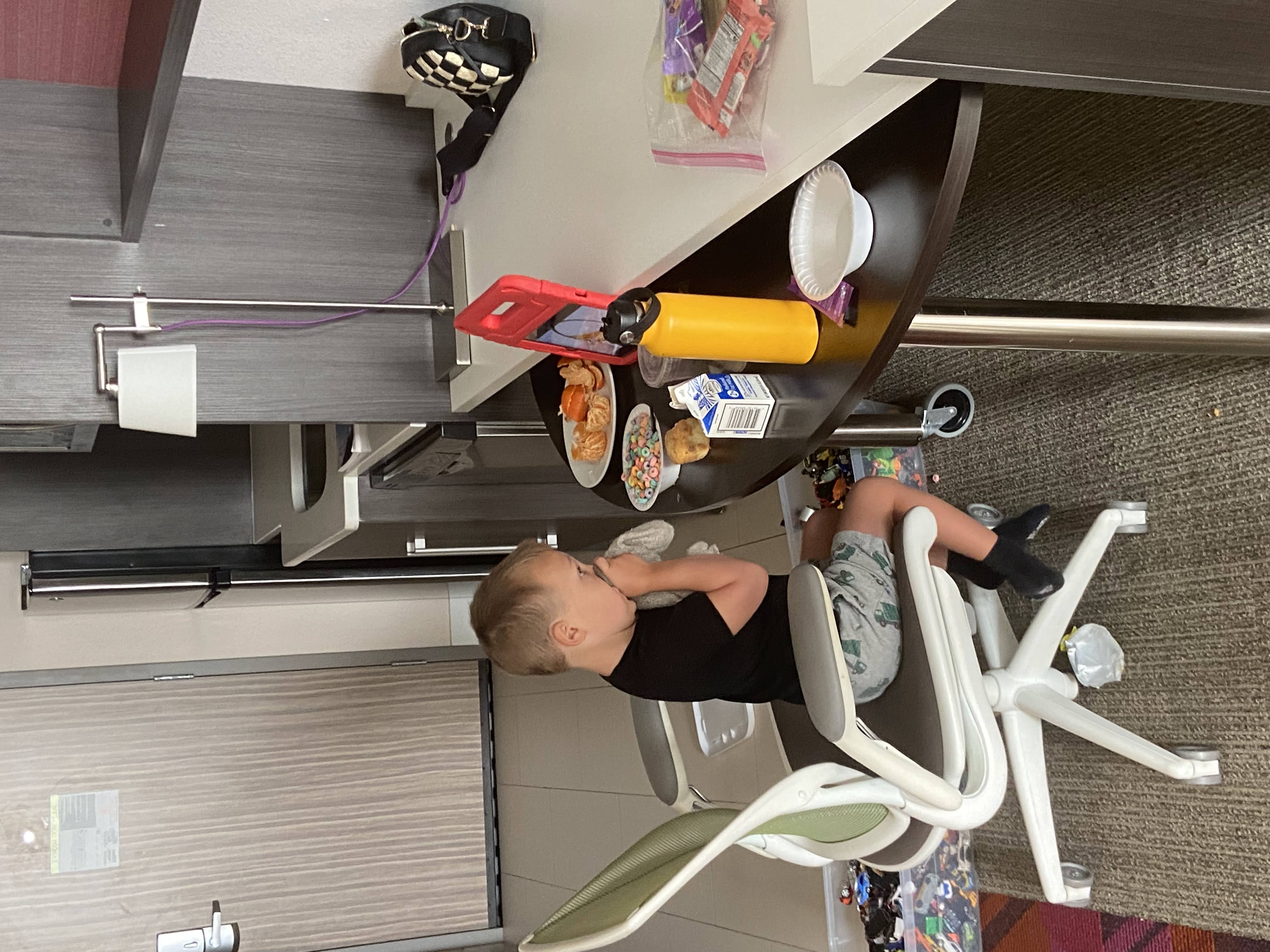 We stayed at a hotel in Wichita. We had a difficult time getting Calvin to go to sleep - he is not used to sleeping in the same room as us and would not stay in his bed. He was being his alter ego, the “Calvin Kitty”. Here’s the next morning’s breakfast time: